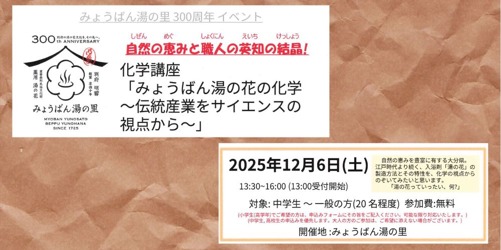 HOME > お知らせ > お知らせ みょうばん湯の里300周年イベント化学講座のお知らせ 2025年11月12日 12月6日(土)に中学生・高校生(小学校高学年)を対象とした「みょうばん湯の花の化学」がみょうばん湯の里で開催されます。詳細はPDFをごらんください。 Twitter Share Pocket Hatena Pinterest LINE -お知らせ